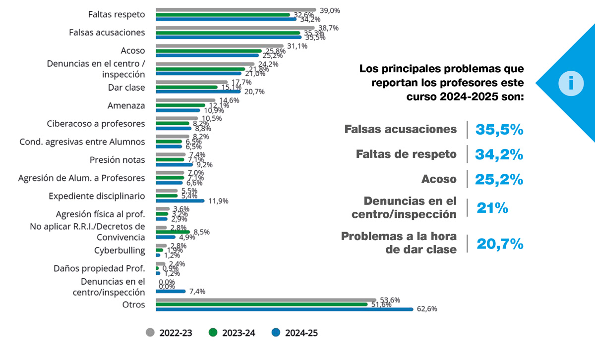 En términos absolutos disminuyen todas las tipologías de problemas con respecto al curso anterior, mientras que en términos relativos aumentan con los alumnos (38,5 % frente a 35,2 %), familias (36 % frente a 30,9 %) y disminuyen otros problemas (76,2 % frente a 62,2 %). Los principales problemas que reportan los docentes este curso 2024-2025 son: falsas acusaciones de padres y alumnos (35,5 %), faltas de respeto de padres y alumnos (34,2 %), acoso de padres y alumnos (25,2 %), denuncias en el centro e inspección de familias (21 %), problemas para dar clase (20,7 %). Desciende el número medio de problemáticas que indican los profesores, de 3,2 de media en 2023-2024, a 2,9 de media en 2024-2025. Los profesores con mayor experiencia y los comprendidos entre 5 y 10 años de experiencia son los que reportan un mayor número de problemas.