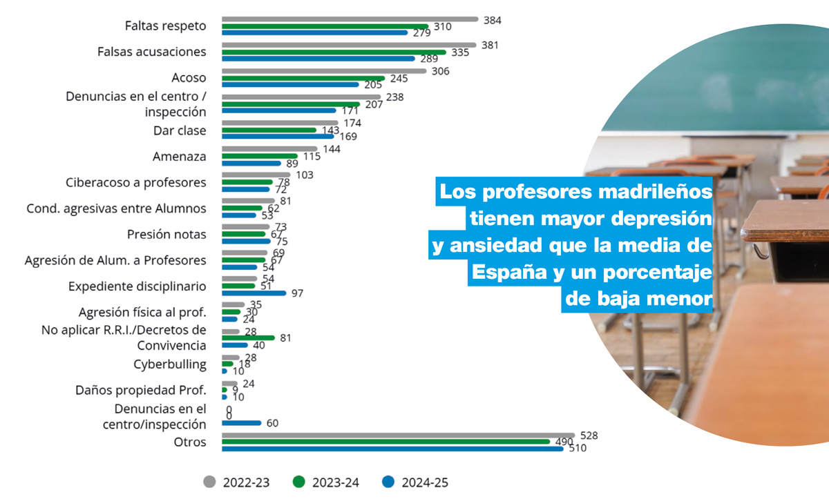 En términos absolutos disminuyen todas las tipologías de problemas con respecto al curso anterior, mientras que en términos relativos aumentan con los alumnos (38,5 % frente a 35,2 %), familias (36 % frente a 30,9 %) y disminuyen otros problemas (76,2 % frente a 62,2 %). Los principales problemas que reportan los docentes este curso 2024-2025 son: falsas acusaciones de padres y alumnos (35,5 %), faltas de respeto de padres y alumnos (34,2 %), acoso de padres y alumnos (25,2 %), denuncias en el centro e inspección de familias (21 %), problemas para dar clase (20,7 %). Desciende el número medio de problemáticas que indican los profesores, de 3,2 de media en 2023-2024, a 2,9 de media en 2024-2025. Los profesores con mayor experiencia y los comprendidos entre 5 y 10 años de experiencia son los que reportan un mayor número de problemas.
